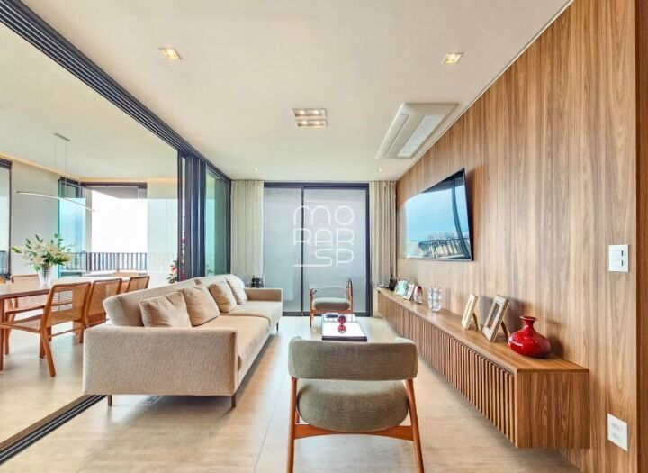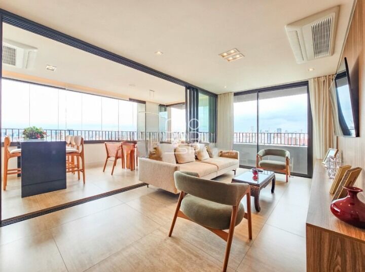 A área íntima conta com três suítes confortáveis, sendo a master ampla, com varanda exclusiva e closet generoso. O apartamento possui ar-condicionado em todos os ambientes, marcenaria Dellano em todo o imóvel, adega, home office, cozinha equipada com eletrodomésticos Electrolux já instalados e lavanderia funcional. São duas vagas de garagem com tomada para carro elétrico, depósito privativo e infraestrutura completa, incluindo gerador full e elevador de delivery.
