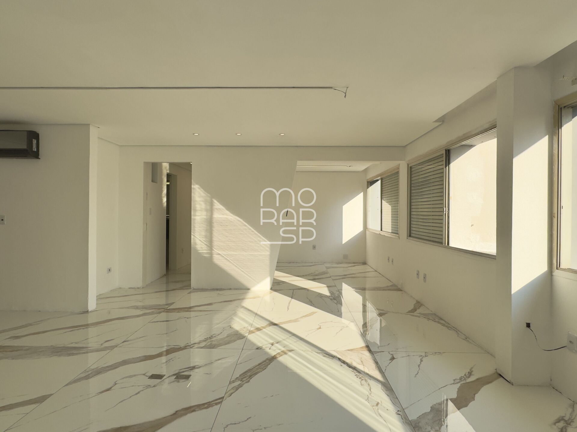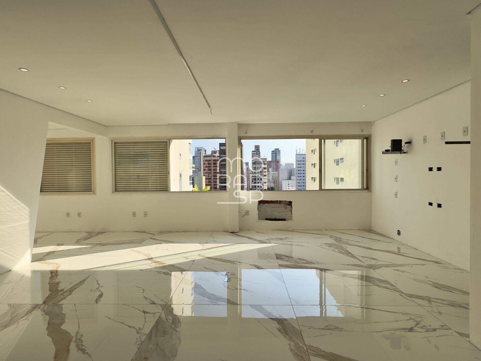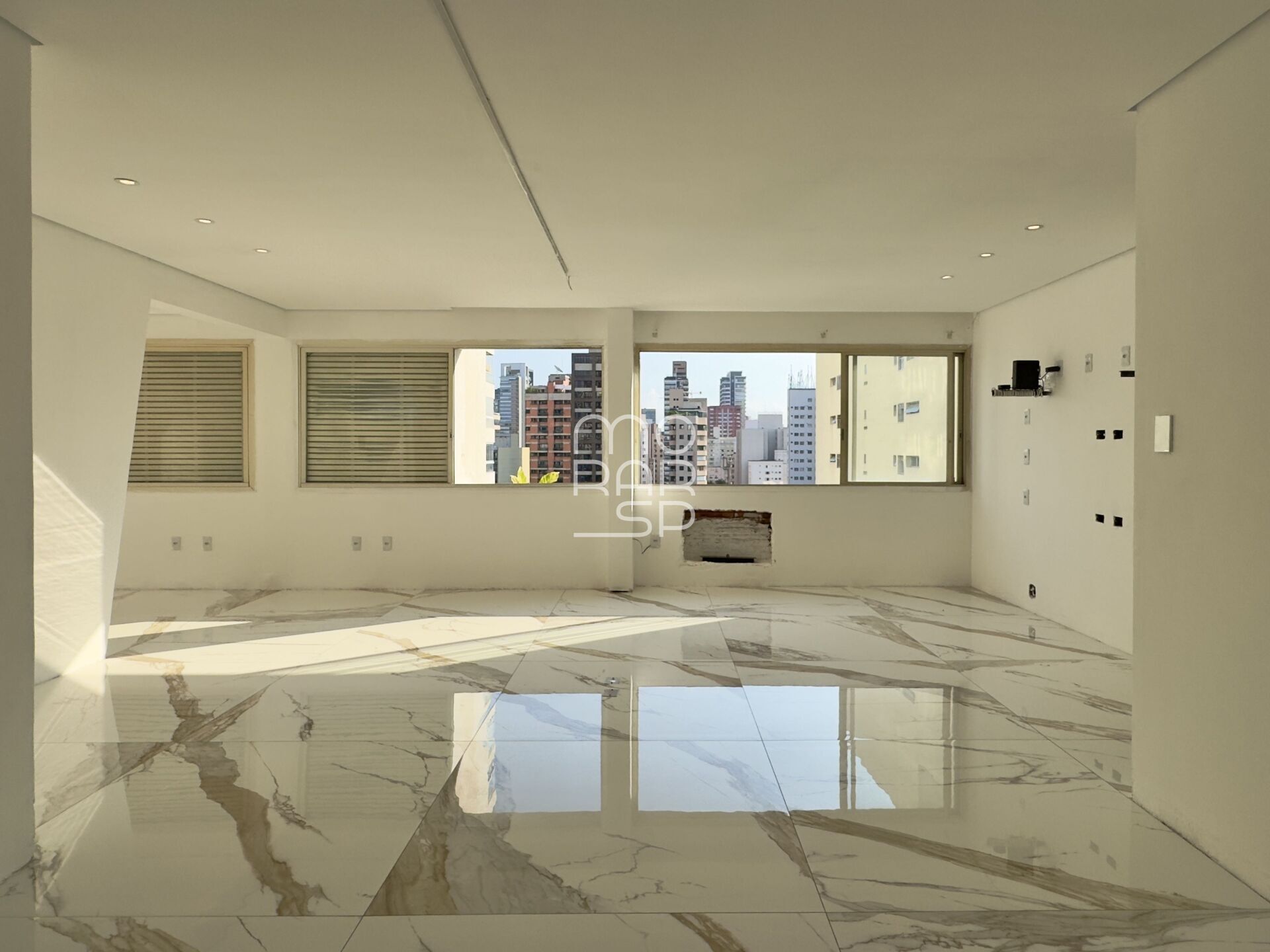 Andar alto, janelões e vista para o por do sol.