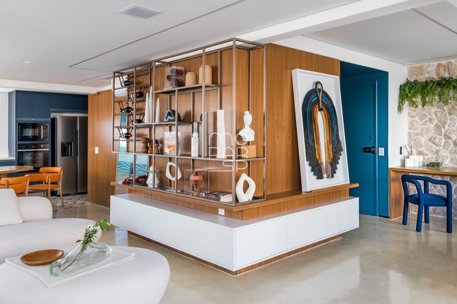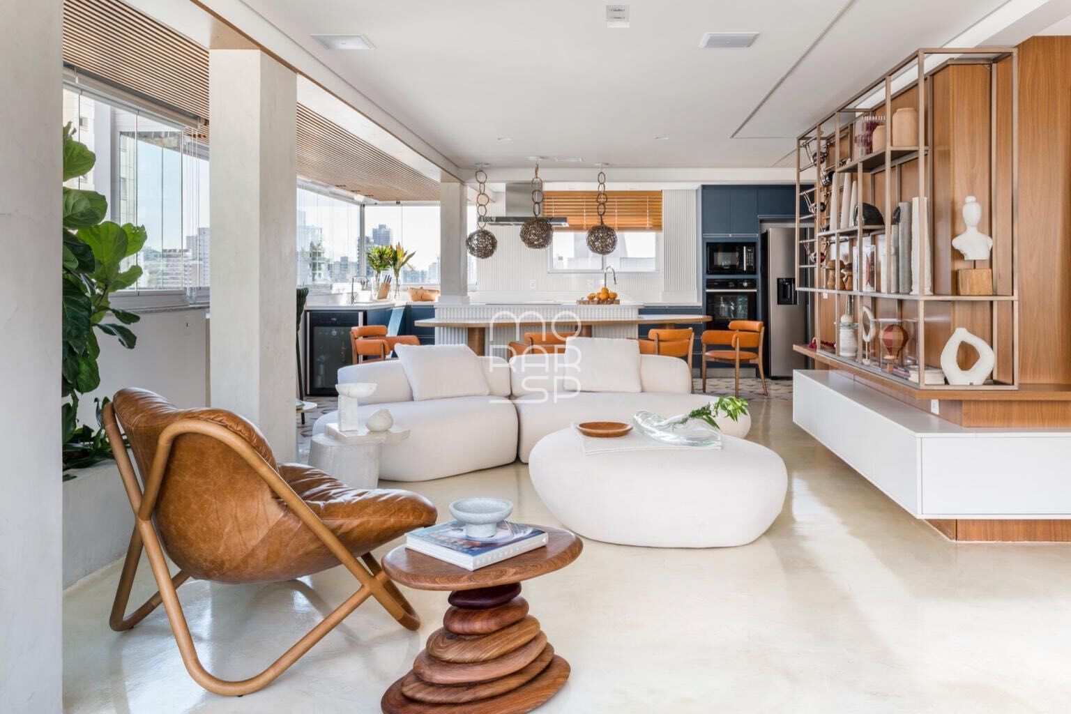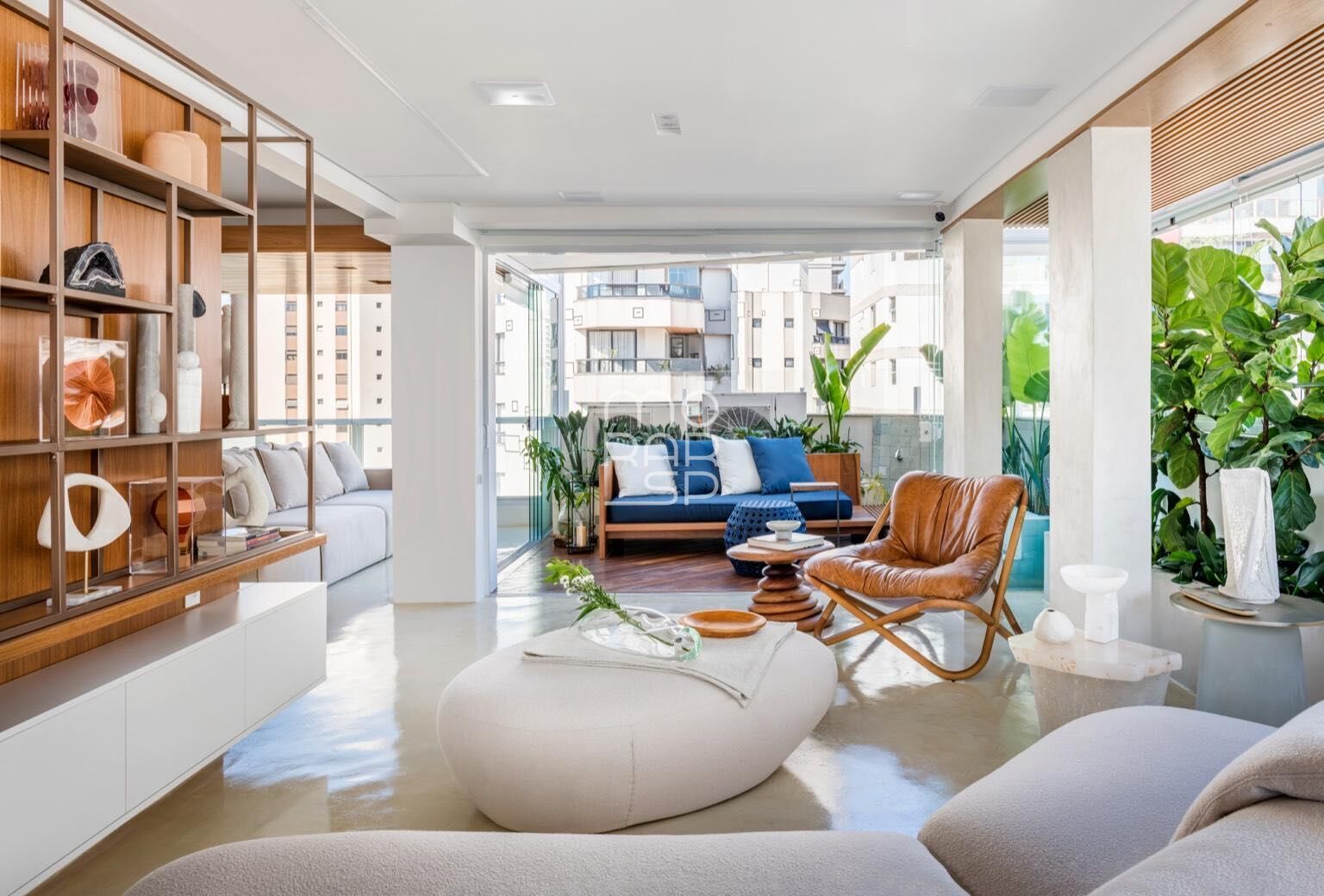 O living, distribuído em três ambientes, integra-se de forma fluida à cozinha, à área de estar com livraria e marcenaria em ângulo, à sala de TV e ao acesso direto à varanda, criando uma dinâmica espacial contínua e bem resolvida. A área social recebe excelente luminosidade natural ao longo do dia, ampliando a sensação de conforto e proporção dos ambientes.