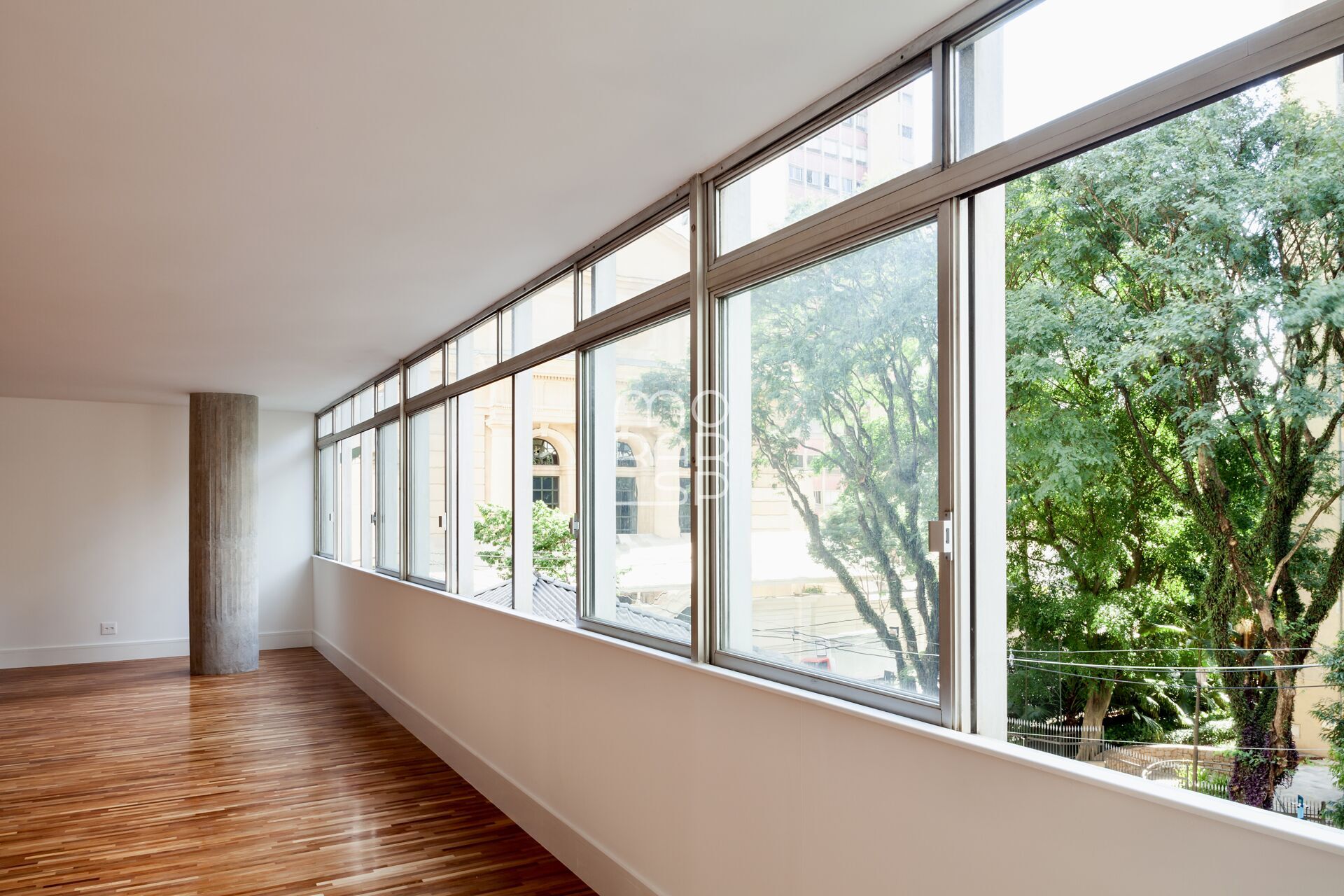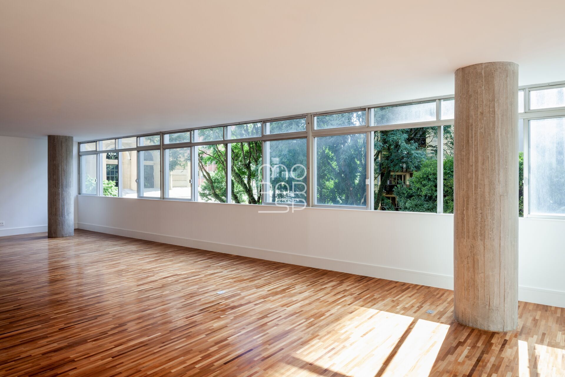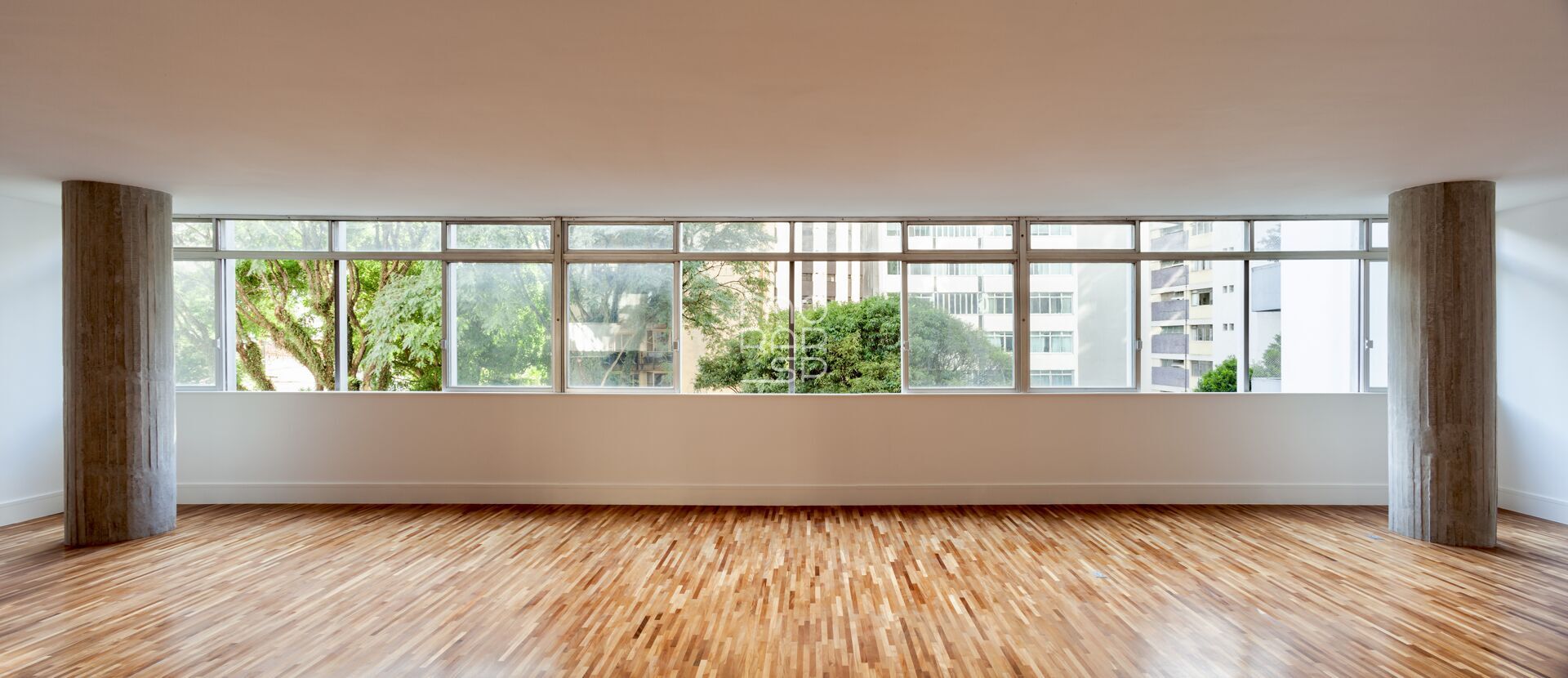 Seu amplo living para 3 enormes ambientes, com uma janela em fita de ponta a ponta, seus pilares redondos internos e os tacos de madeira do piso evocam a sofisticação que o modernismo traz de melhor. Um lavabo atende com discrição os convidados próximo ao hall de entrada.