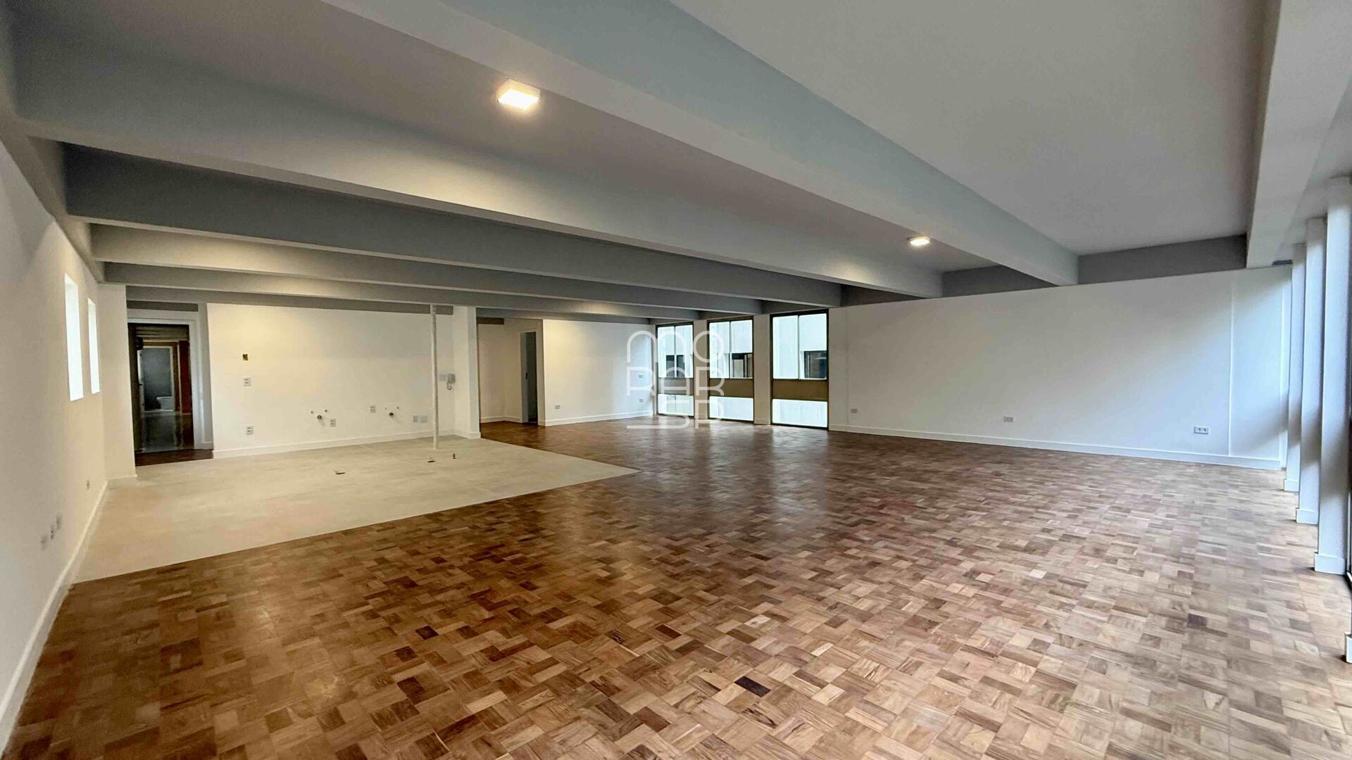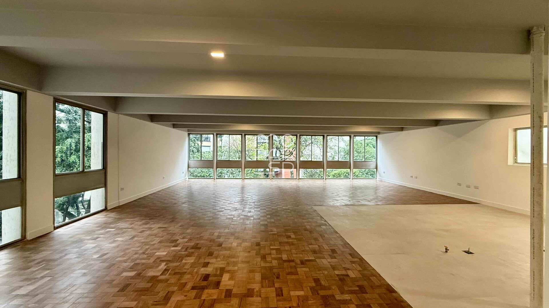 Logo que adentramos nele, uma parede bem em frente à porta, delimita o hall de entrada. À esquerda, um enorme lavabo atende com conforto e discrição os convidados. Porém , em frente ao lavabo, uma enorme abertura descortina um living cinematográfico, com formato quadrado, pisos de tacos de madeira e uma sequência de janelas do chão ao teto. Essas, conectam o interior do apartamento às copas das árvores da rua, numa simbiose onde a vegetação externa parece fazer parte do paisagismo interno. O living comporta 3 enormes ambientes e onde antes havia as paredes que delimitavam a cozinha, hoje fazem parte do living, deixando um espaço amplo e perfeito para a criatividade reinar absoluta e formatar a cozinha dos sonhos conectada às salas e à vista exterior.