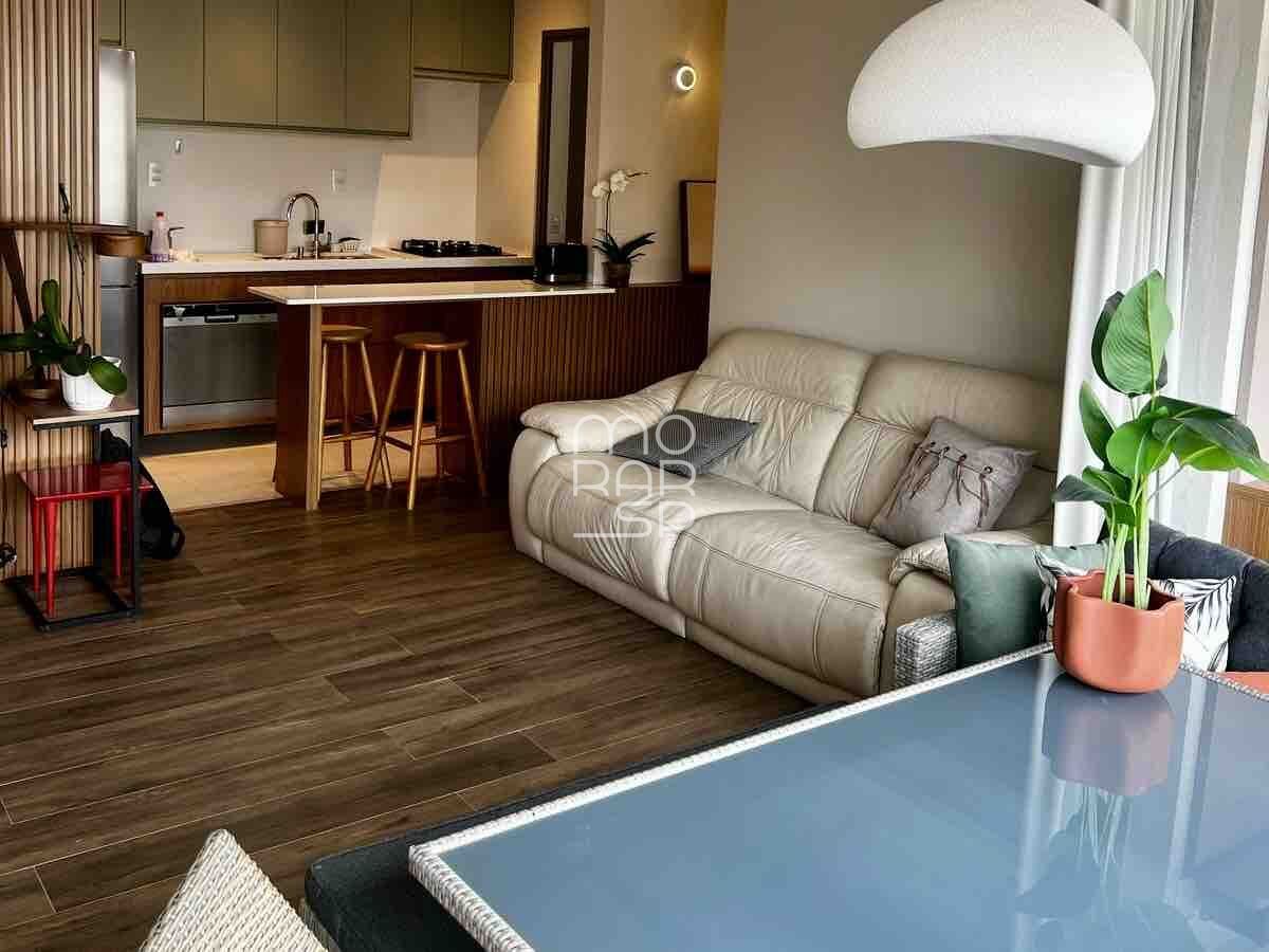 Esse charmoso apartamento de 74m2, situado num edifício novo, possui um living que comporta uma estar com tv, possui além da cozinha integrada, a sacada também. A sacada, inclusive, é do tipo gourmet, ampla e onde está a sala de jantar, além do espaço para home office.