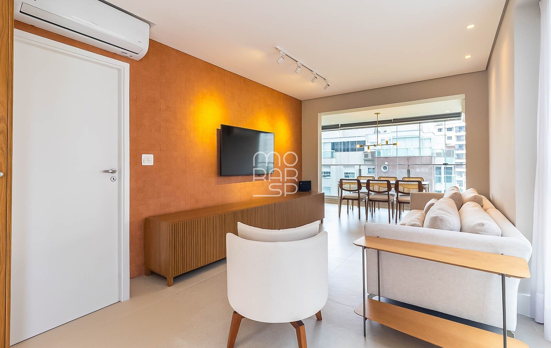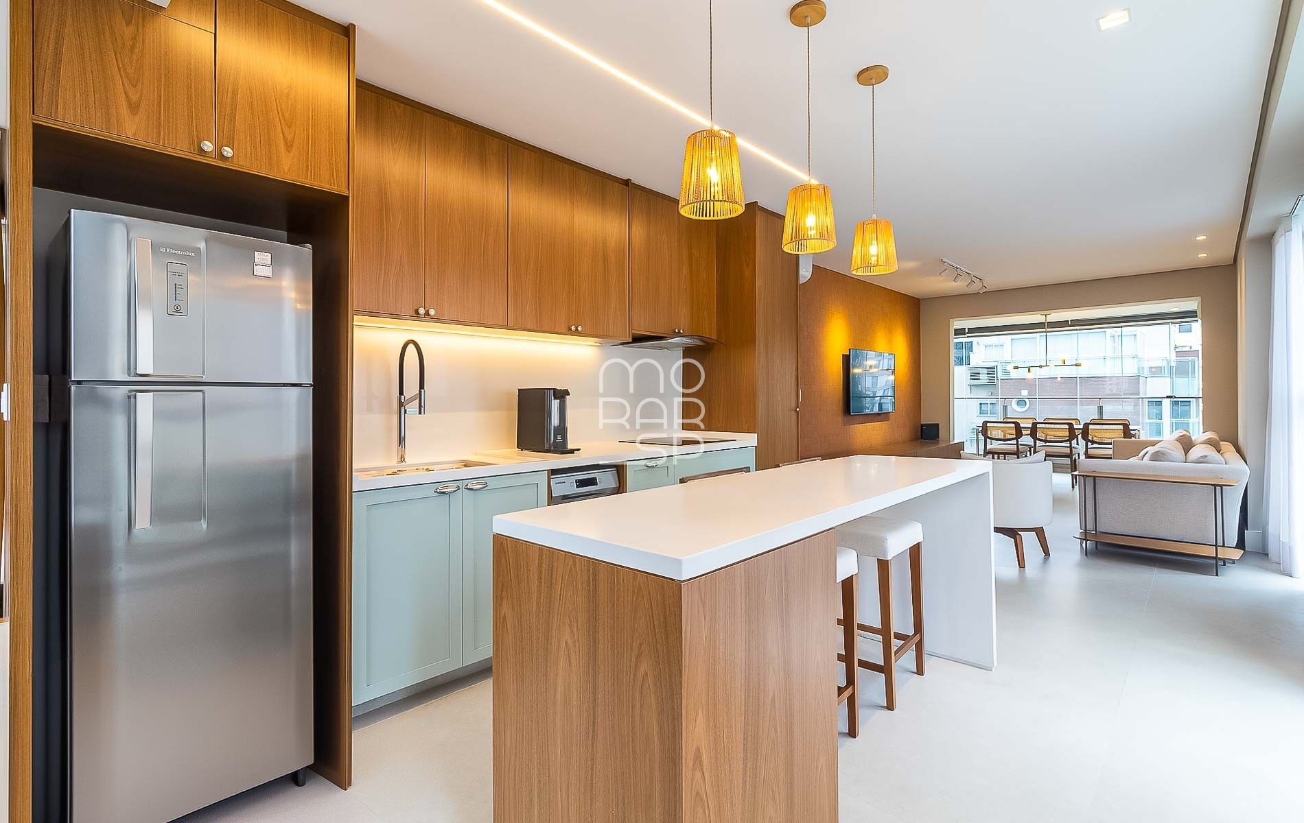 Totalmente mobiliado e reformado, o apartamento está pronto para morar. A cozinha com ilha se conecta ao living em um layout leve, onde sala de jantar e TV dividem o espaço com fluidez. O lavabo logo na entrada e os acabamentos bem escolhidos completam a sensação de um lugar que já acolhe desde o primeiro dia.