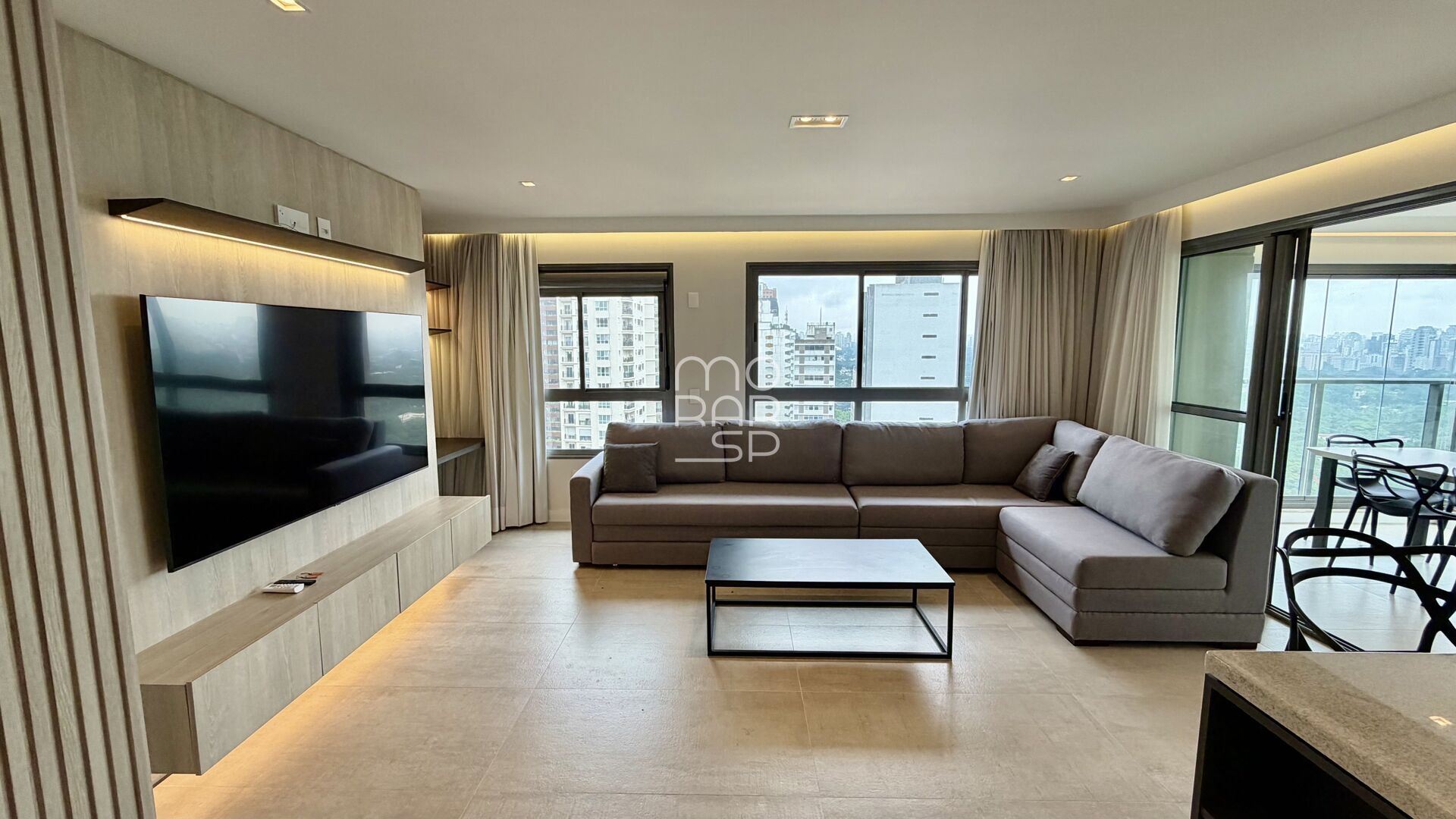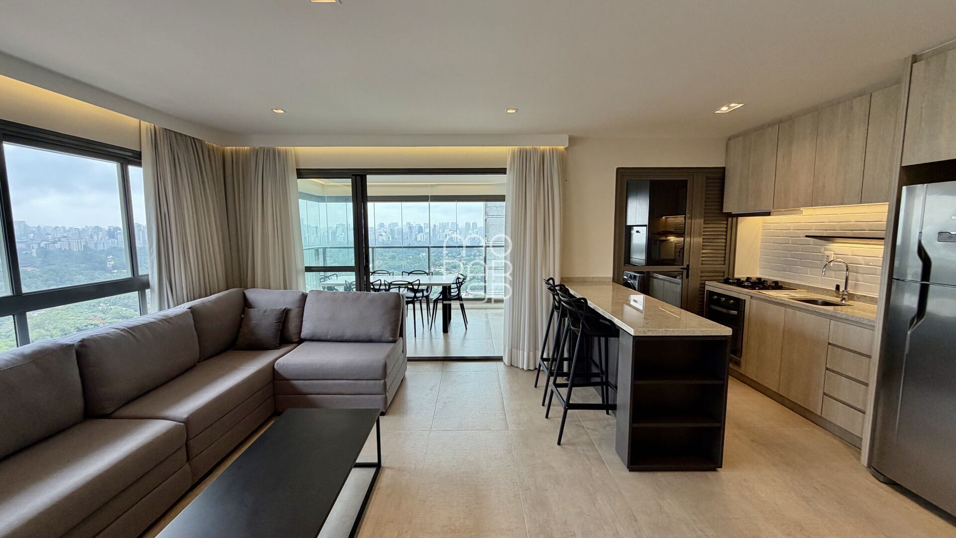 O living integra-se à varanda com churrasqueira e pia de apoio, criando um espaço agradável para receber. A cozinha conta com marcenaria planejada e conexão prática com a área social, além de área de serviço.