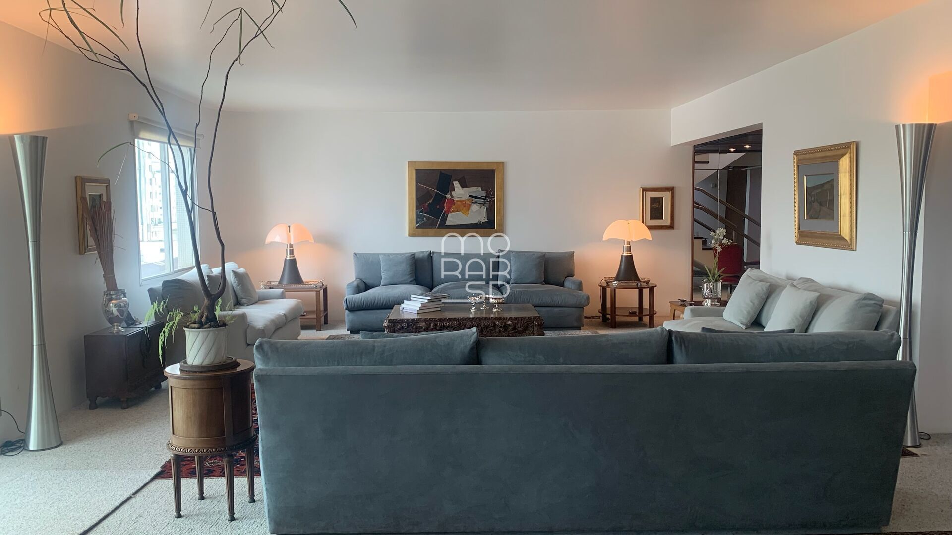 Um espetáculo de imóvel, logo na entrada, somos recebidos num hall bem chic, porém minimalista. Assim que entramos, uma vastidão de salas enchem nossos olhos, e uma escadaria maravilhosa cria um volume escultural que arremata tudo. Um amplo living para 3 ambientes, sendo o jantar separado por portas de correr em madeira maciça. Três sacada do tipo balcão coroam o living. Um belo lavabo atende as visitas com classe.
