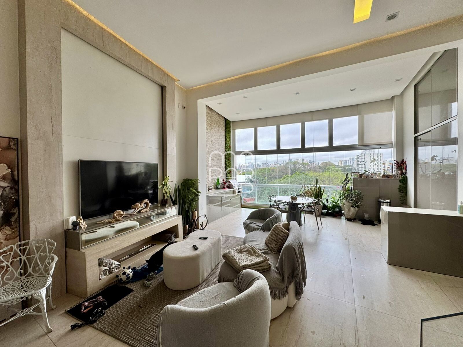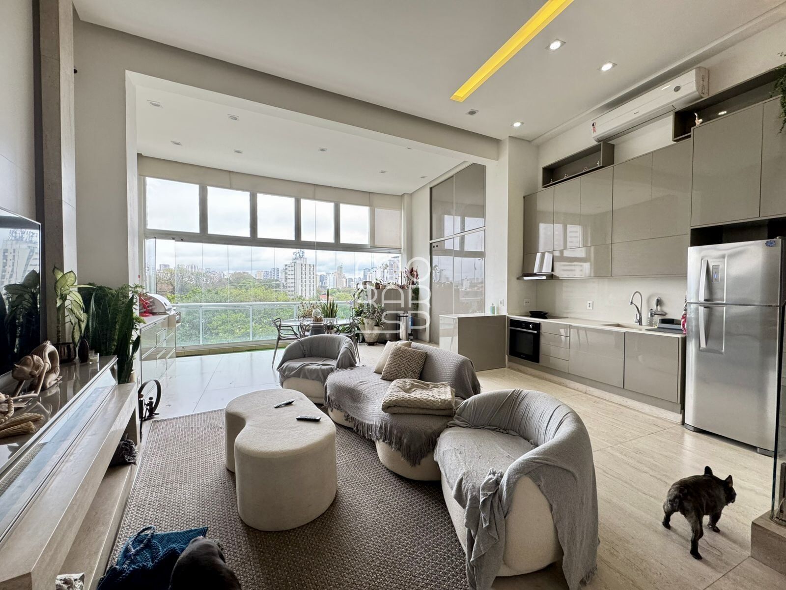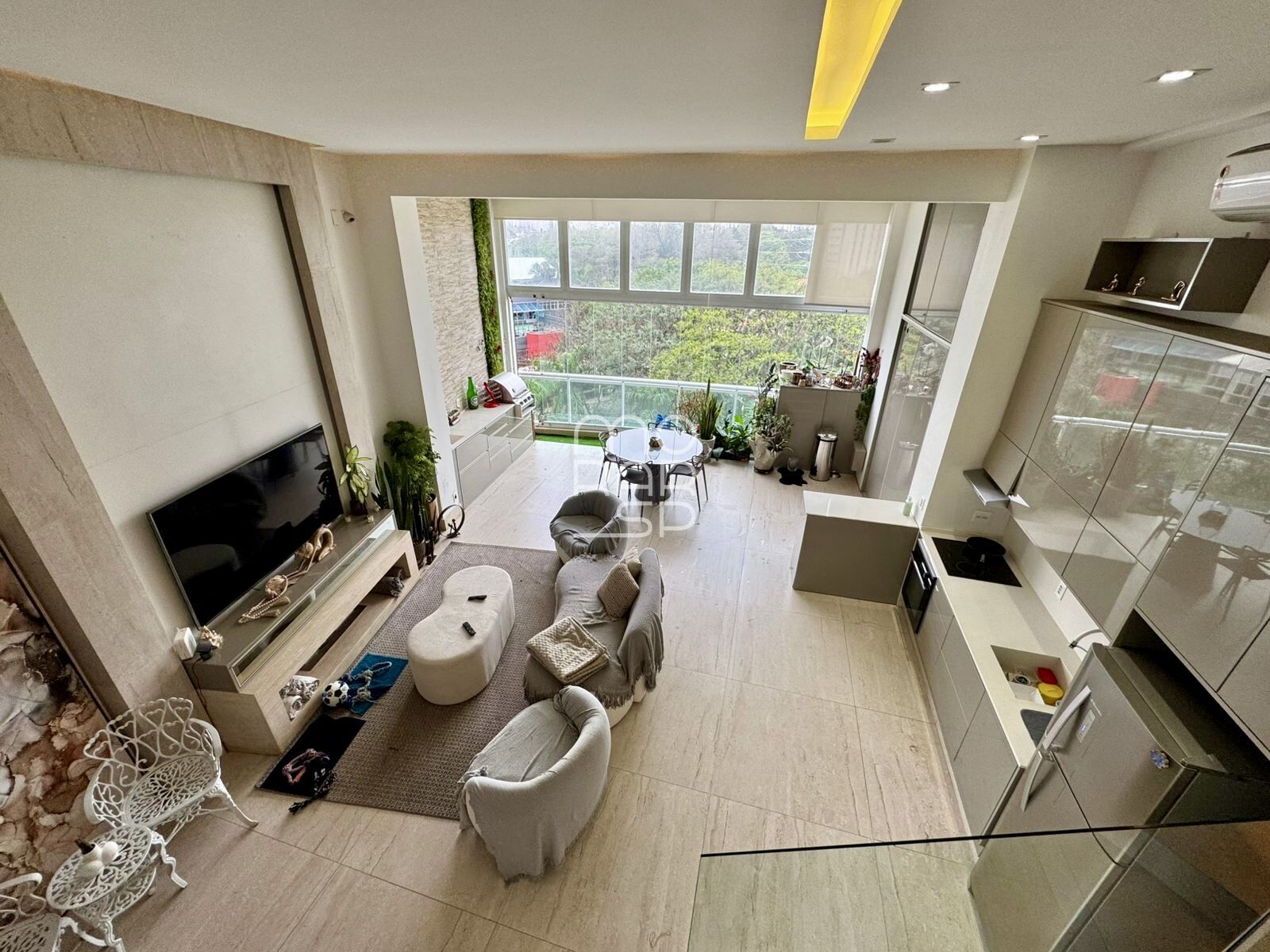 No piso inferior, onde mais da metade dele possui pé direito duplo, localiza-se o amplo living para 2 ambientes, a cozinha integrada e uma área embaixo do mezanino que pode ser seu Home-office, uma segunda suíte ou aquilo que a sua necessidade pedir. A ampla sacada foi fechada com vidros na altura do pé direito duplo e integrada ao living proporcionando mais iluminação, ventilação;ação e amplitude ao espaço.